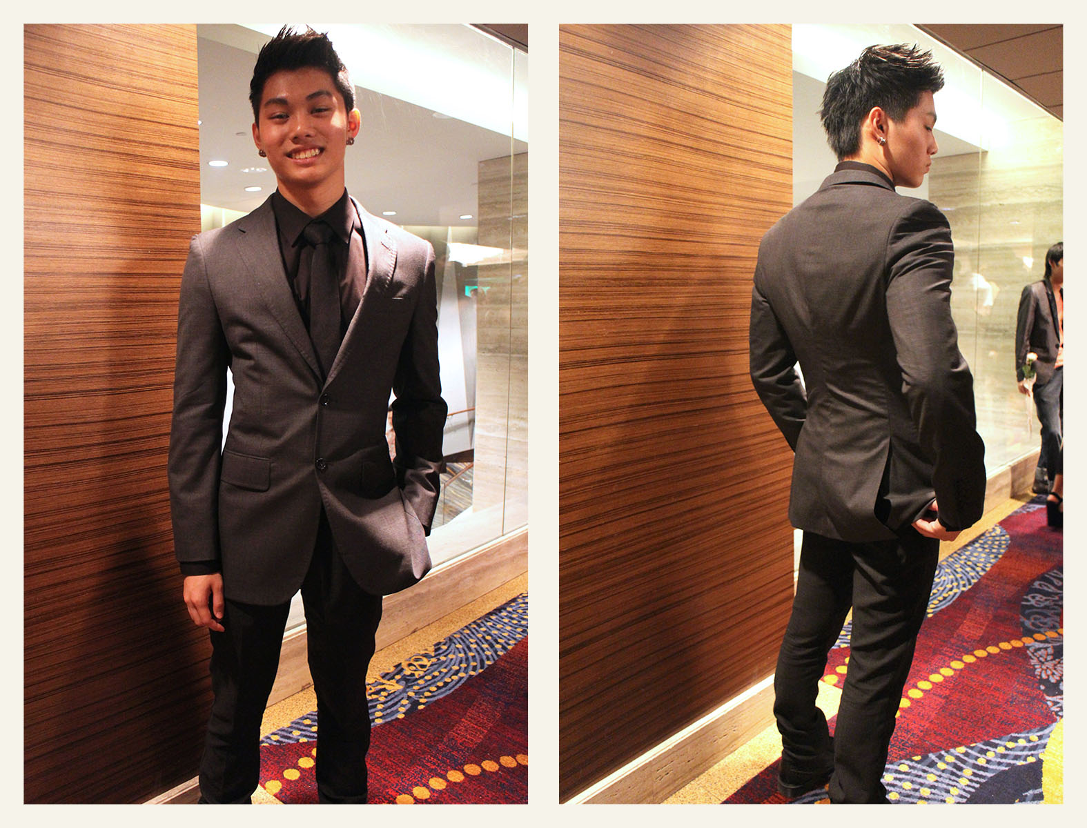 Dillon sported this season’s tonal outfitting trend in a suit by Oxford which featured varying shades of grey and black. He managed to keep the look simple, yet eye-catching just by picking a very fitting suit, complete with neatly styled hair.