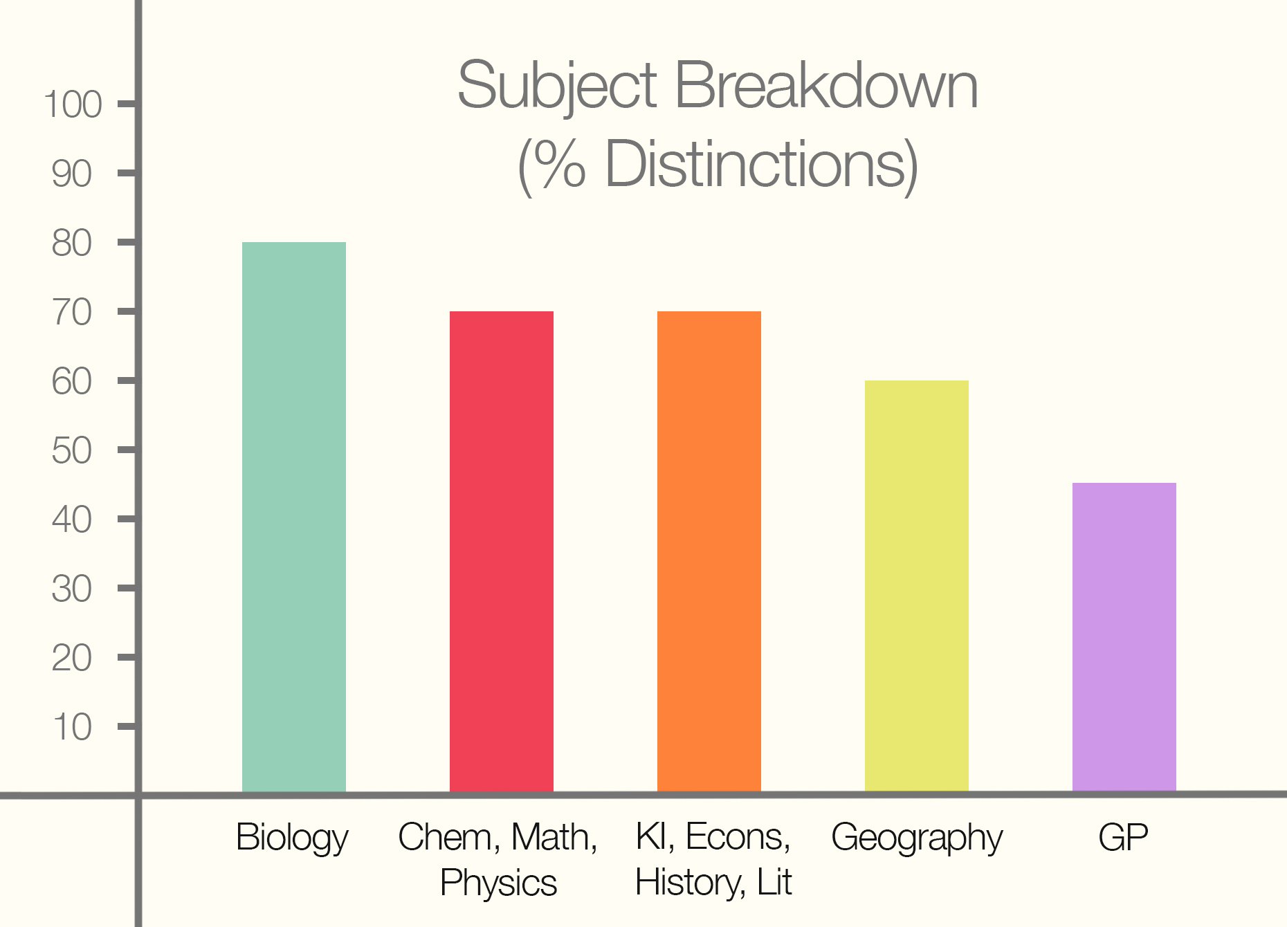 Subjects-wise, Biology maintained a 80% distinction rate, as did Chemistry, Mathematics, Physics, and History at 70%. Economics has shown an encouraging improvement with a 70% distinction rate as well, and one Economics tutor enthused that the results “couldn’t be better” and that this year saw “highest distinction rate ever”. The percentage of those scoring distinctions in General Paper, Knowledge & Inquiry, English Literature, and Geography have dipped slightly from the previous year; however, it should be noted that the 2013 ‘A’ Levels featured a revised Literature syllabus as well as the removal of the “Vocabulary” section from the GP paper.